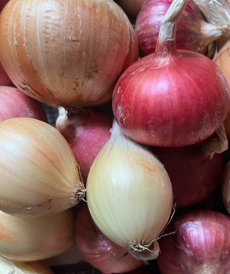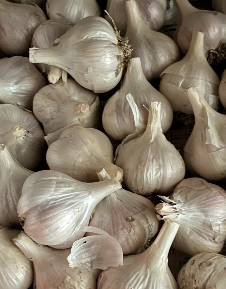 Once removed from the soil, onions and garlic need a warm and dry period, out of the sun, to wither the plant and dry the outer skins. When dry, trim the dried roots and tops and spread into flats to store at or just below 10º C / 50º F.